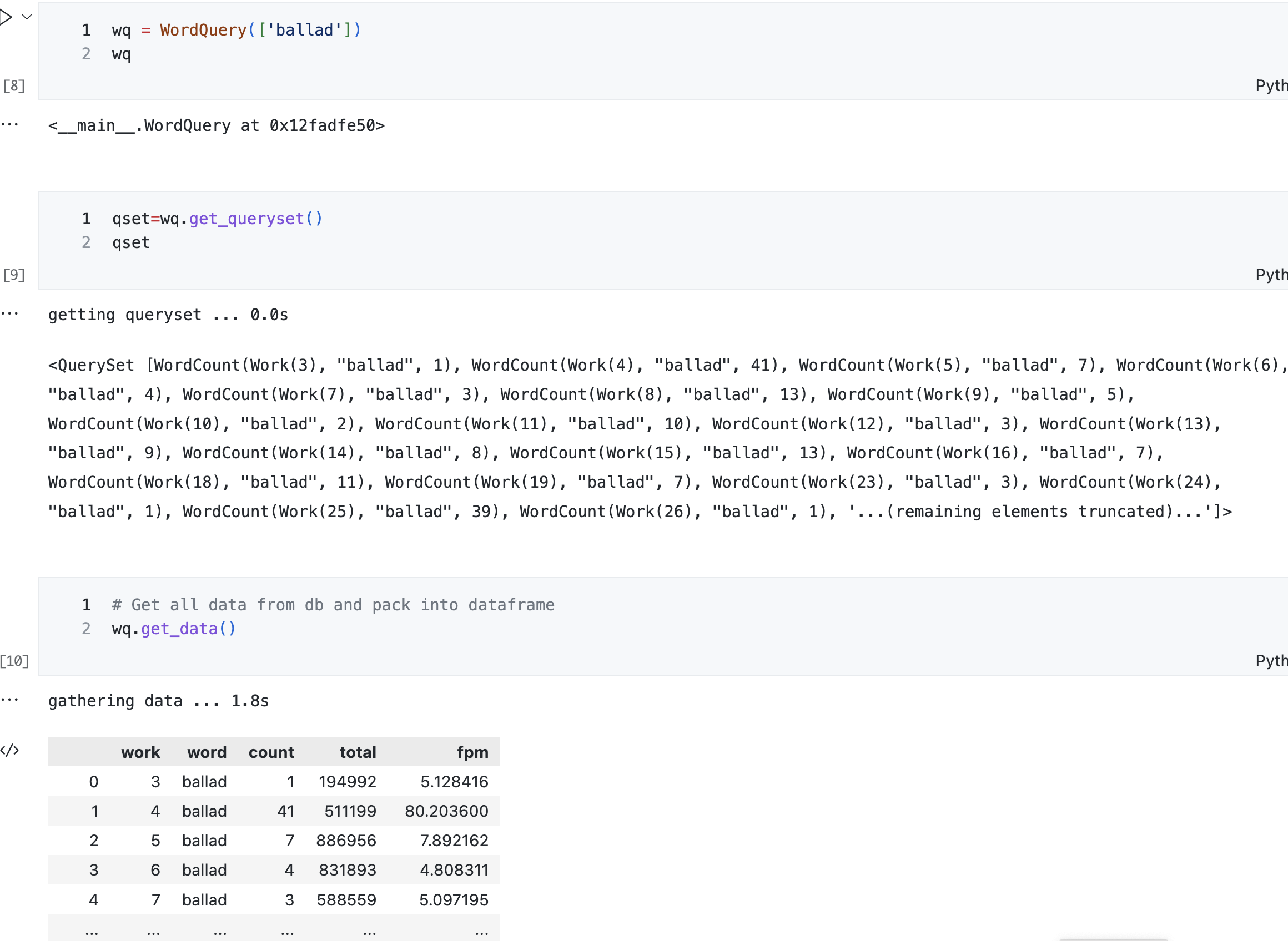 Ryan showed a solution he found that lets Django play nice with Jupyter so you can access querysets and models in a notebook. This way you get all the structure and native field types from the models. You can define arbitrary methods and attach them to existing objects to give them new behaviors, e.g. taking a Princeton Prosody Archive HathiObject and adding a method to get the full text. This behavior might not be needed for the web interface but it is powerful for analytical work.